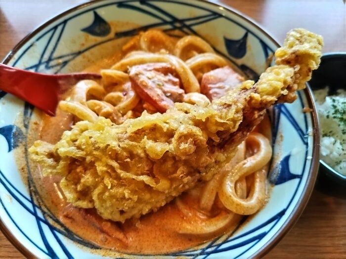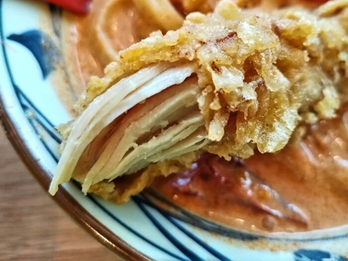 お肉がホロホロでおいしい!!トマたまカレーうどんに『かしわ天』トッピングおすすめです!!