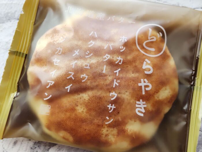 風味の良い粒餡と塩味のバタークリームの心地よいミルク風味が広がる、しっとり、ふんわり食感のバターどら焼きです。