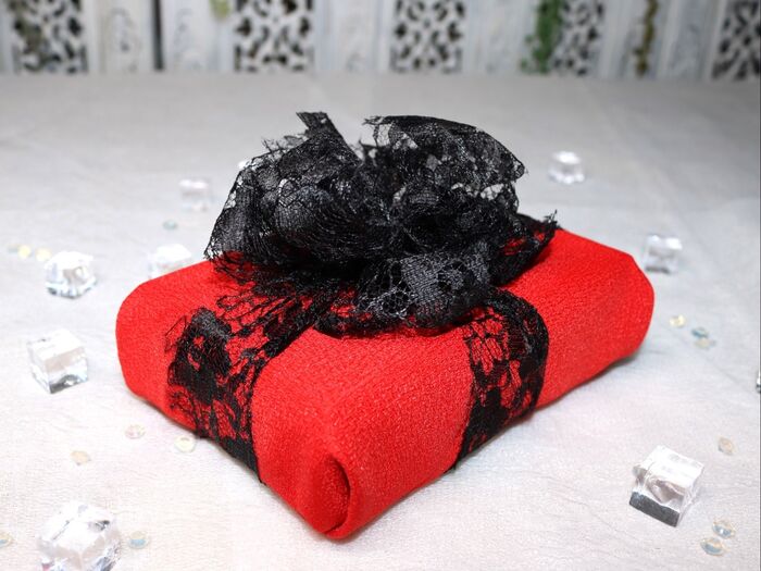 セリアの赤のちりめん風生地と黒のレースを中表にして、グルッと一周縫います。