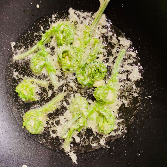 こごみは、渦巻きをほぐすように洗って天ぷらにします。