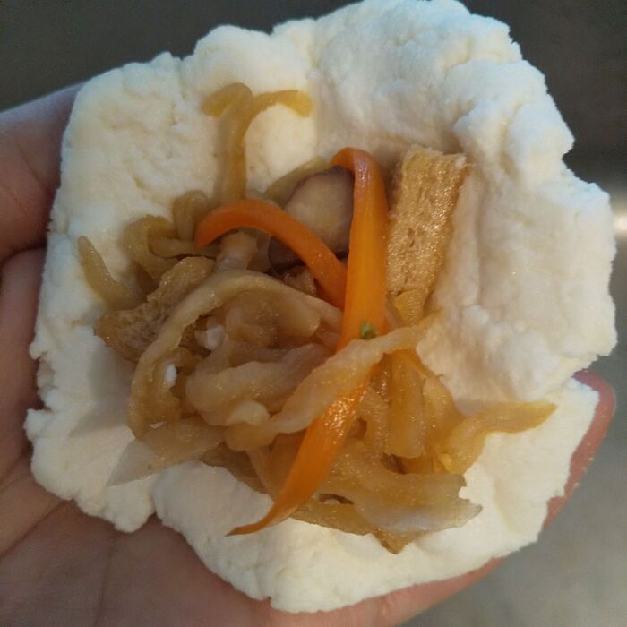 切り干し大根の水分は切っておきましょう。具材はあまり量が多いと包みにくいので、控え目にします。切り干し大根の味がしっかりしているので、生地には味付けをしていません。お好みで塩、砂糖など加えて生地に味付けをしてくださいね(^^)