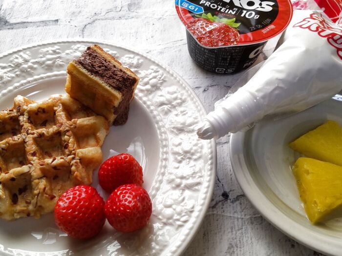 「オイコス」(ストロベリー)を底からすくって、ワッフルに添えるように適量のせます。