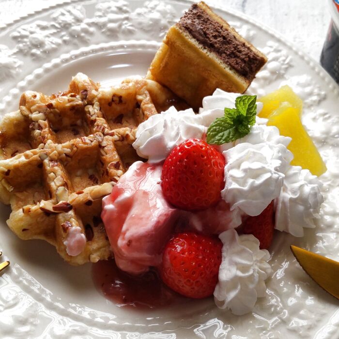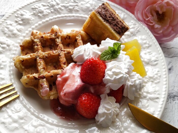 お皿の上に、アーモンドワッフルと、クリームワッフルのショコラを半分カットし、のせます。
