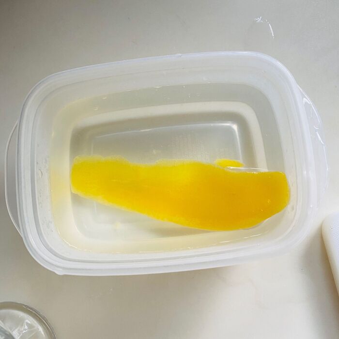 容器にお湯を入れて、少し浸して柔らかくしました。
