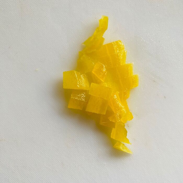 飾り用にドライマンゴーをお湯に浸し、細長く切り、飾ります。
