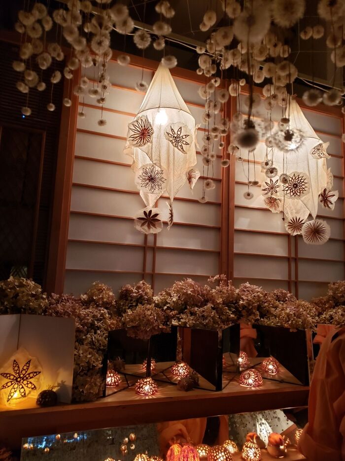 こちらドライフラワーと果物などの皮を使ったアートが見られます。