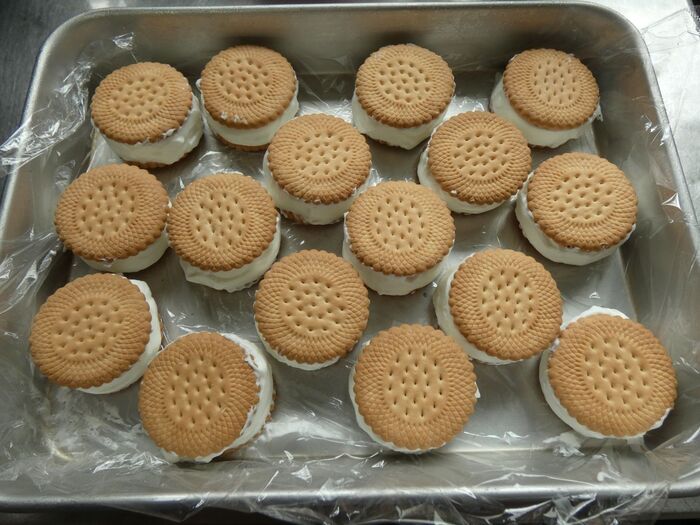 ビスケットにたっぷり挟んで、冷凍庫で凍らせたら完成。