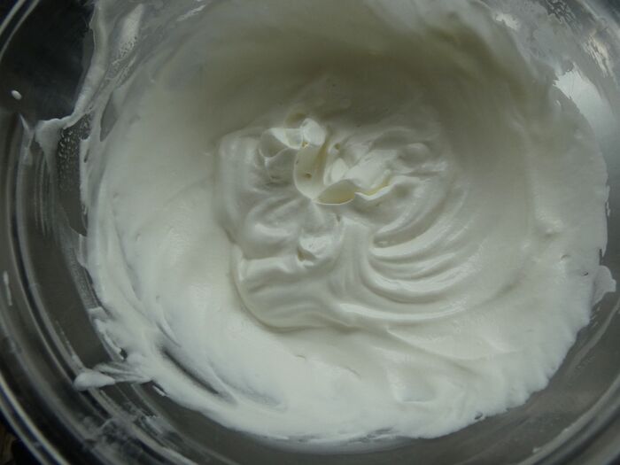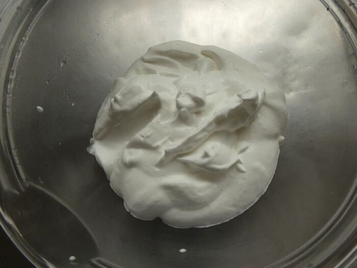 生クリームとゼラチンを合わせるときは、少量の生クリームにゼラチンを混ぜてから全体に合わせるとダマにならずにすみます。