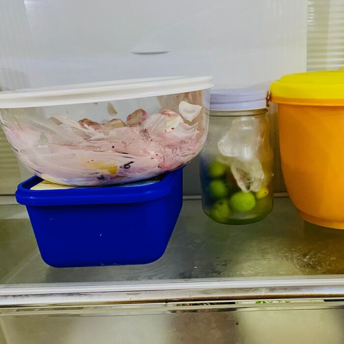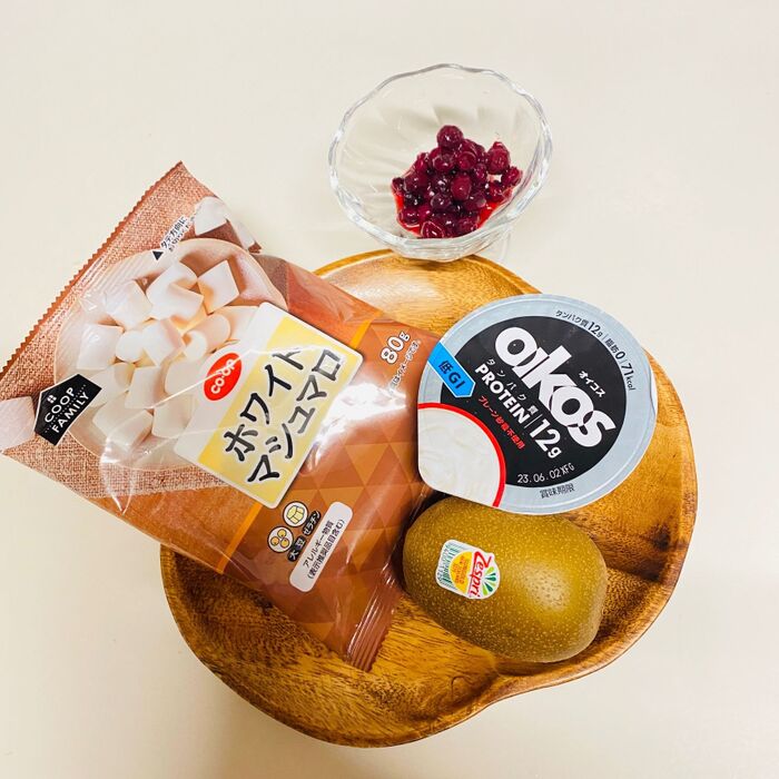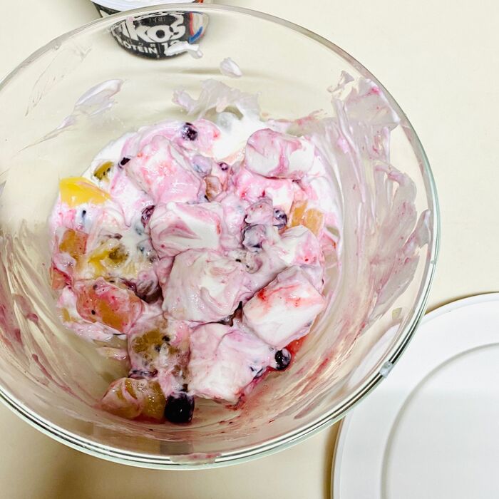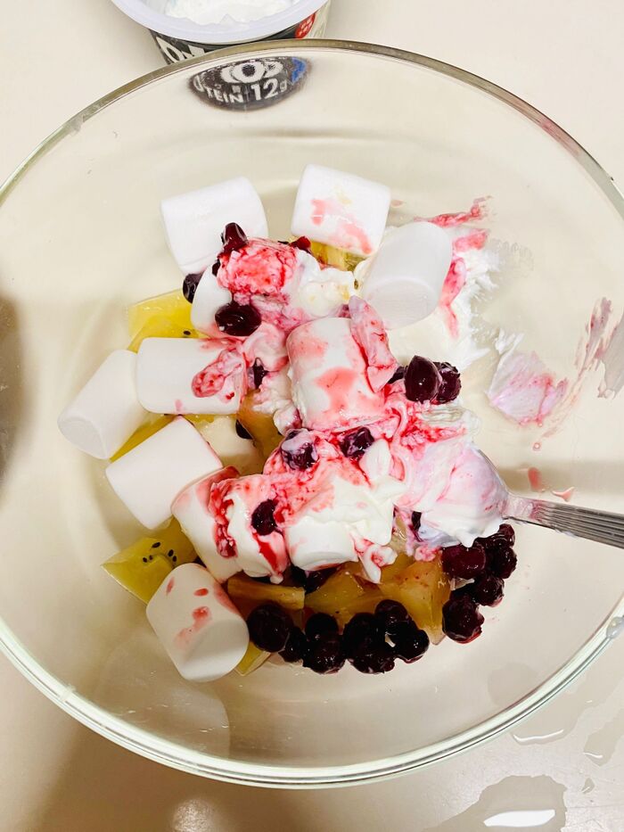 ボールに、細かく切ったキウイフルーツ、自家製ブルーベリージャム、マシュマロ、オイコスを入れます。