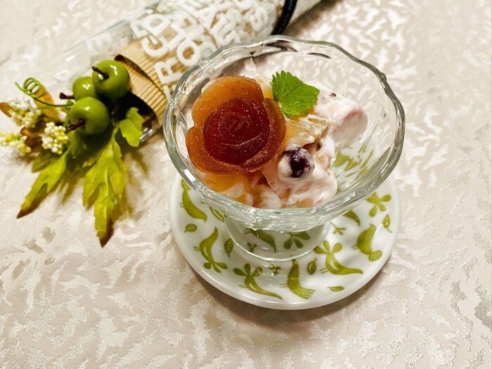 家にあったローズのグミ、自家製レモンバームを飾りました。