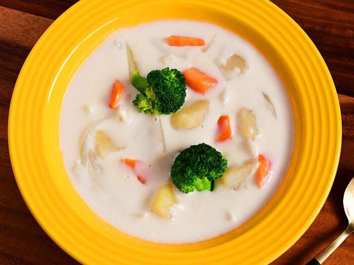料理酒により素材の味が引き出されたクリームシチュー。既製品のルーや油を使わないため、カロリーが控えめなのにコクのある味わいで絶品です。