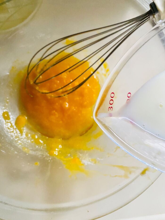 2.牛乳を加えよく混ぜます。牛乳は冷蔵庫から取り出したら、少し常温に置いてからお使いください。