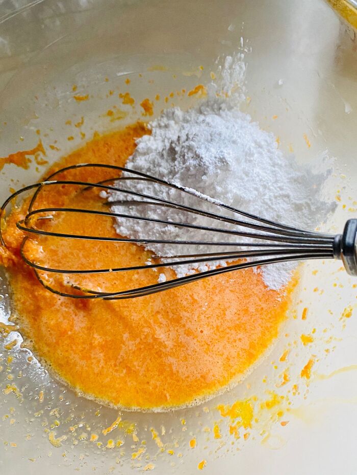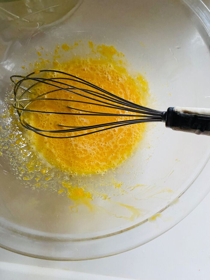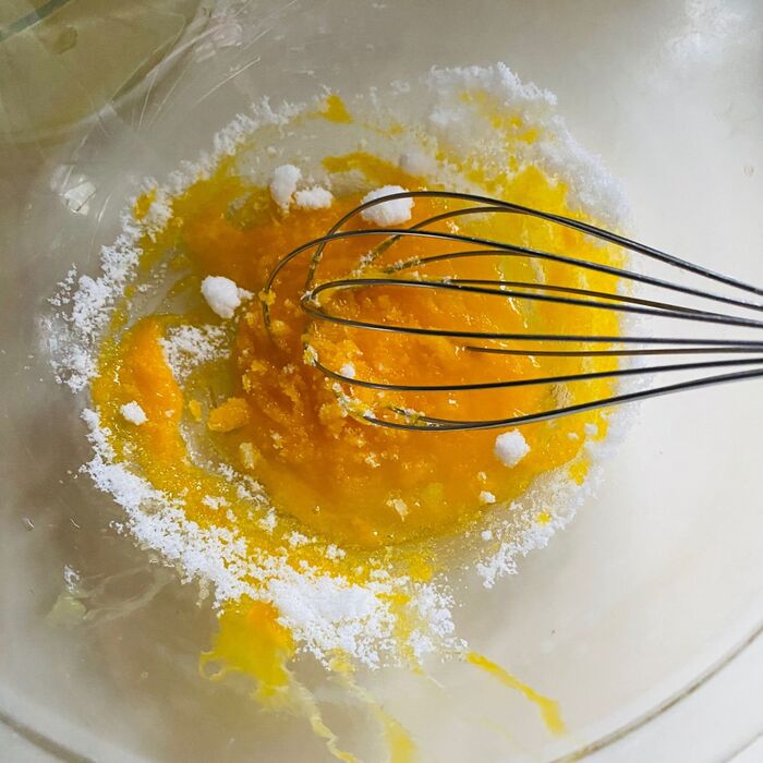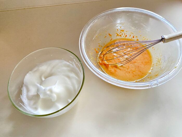 1.卵を割り、卵黄と卵白に分けます。ボウルに卵黄を入れよく混ぜます。砂糖を加えよく混ぜます。