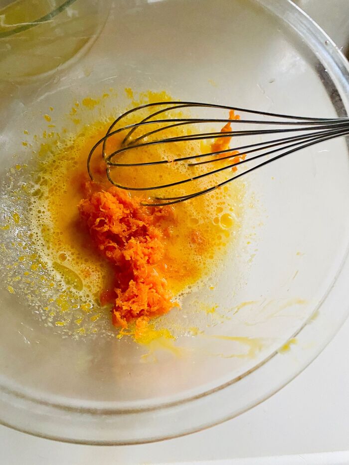 4.あらかじめ、すりおろしたにんじんを入れます。よく混ぜます。