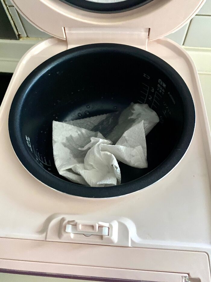 9.キッチンペーパーに油を小さじ1つけ、内釜に塗りよくなじませます。