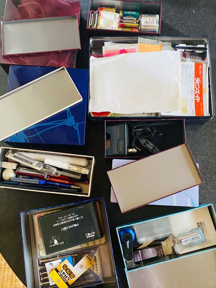 こんな感じで、電池、文房具、お薬、電気カミソリ充電器、アダプターなど細々したものを分別して