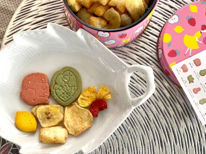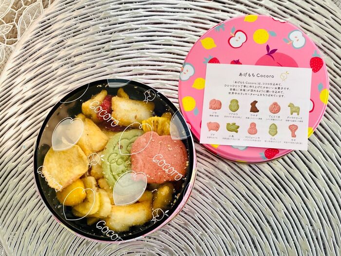 バナナやクランベリーのような彩フルーツ、麻布あげ 塩が、この可愛い缶の中にミックスされていて、飽きのこない美味しいお菓子になっています。