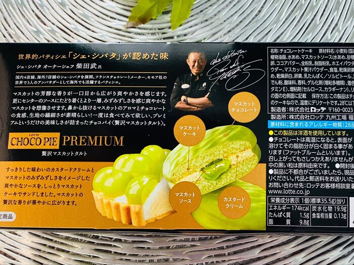 パッケージの裏面には腕組みをした巨匠!世界的パティシェ「シェ・シバタ」が認めた味とありました。