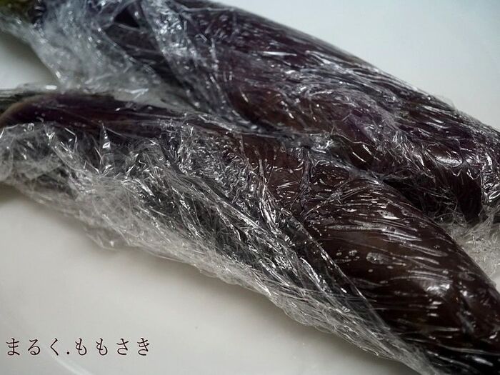 ①茄子を洗い串で10ヶ所穴を開け1個ずつラップで包む。