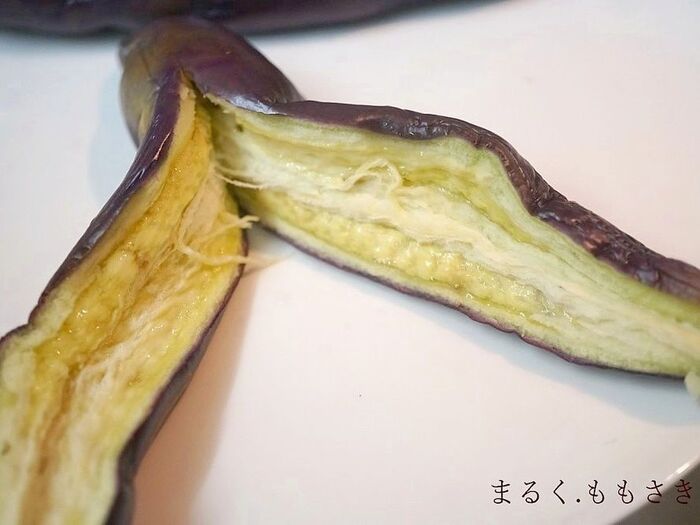 ※今回長茄子を使ったので、割いてから半分にカットしています。