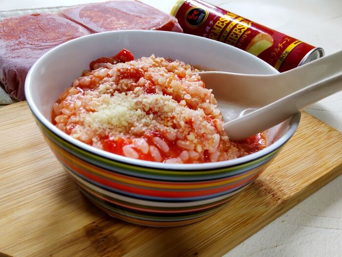 小鍋に、解凍したトマトソースと水、パルメザンチーズ、ご飯を入れて煮ます。