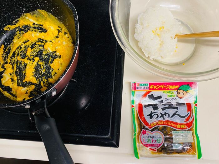 ①ボウルに卵を割入れ砂糖を加え混ぜます。フライパンが温まりましたら、炒り卵を作ります。テフロン加工なので油は使いませんよ。