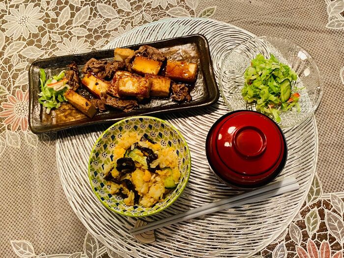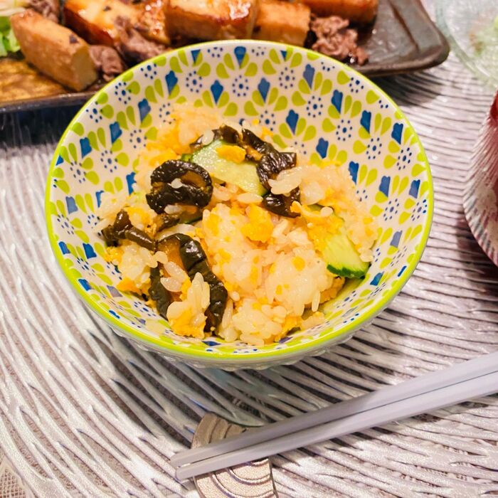 キューちゃんの混ぜご飯に、少しお肉を焼いて入れたらもう最高!