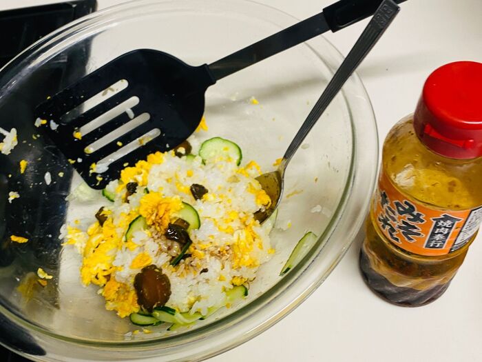 ②ボウルにご飯をいれ、①、スライスしたきゅうり、Qちゃんを入れます。食べやすいように細かく切って下さい。焼肉のたれを加え、味を調整します。
