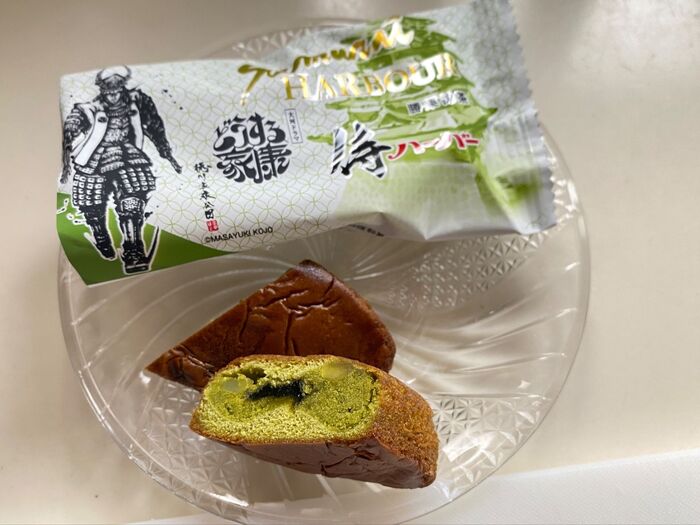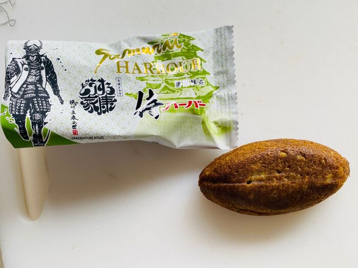 1つ目はパッケージには侍ハーバー、大河ドラマ『どうする家康』徳川家康がデザインされています。勝栗抹茶味です。