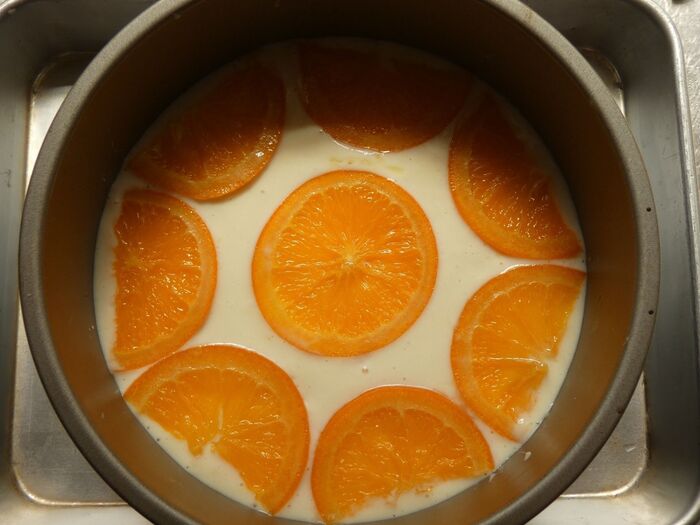 型にそっと流し込んだら、飾り用オレンジを乗せ冷蔵庫で冷やし固めて完成。