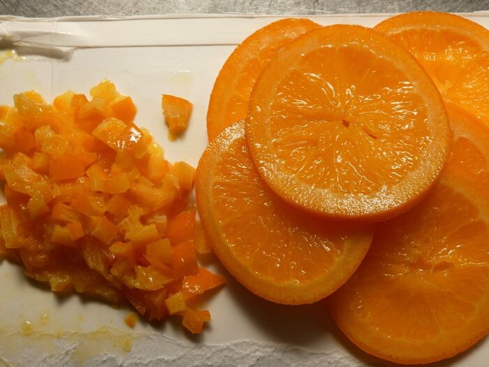 オレンジのシロップ煮は5枚くらいを残して刻みます。