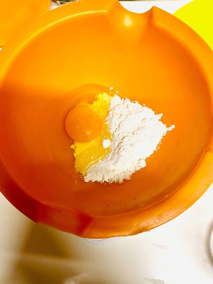 ②衣を作ります。ボールに卵を割り入れ小麦粉を加え混ぜます。水を少しずつ入れてよく混ぜます。