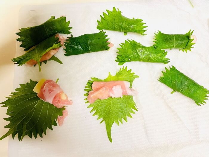 ①大葉に適当に切った豚肉スライス、スライスチーズを乗せくるくる巻きます。