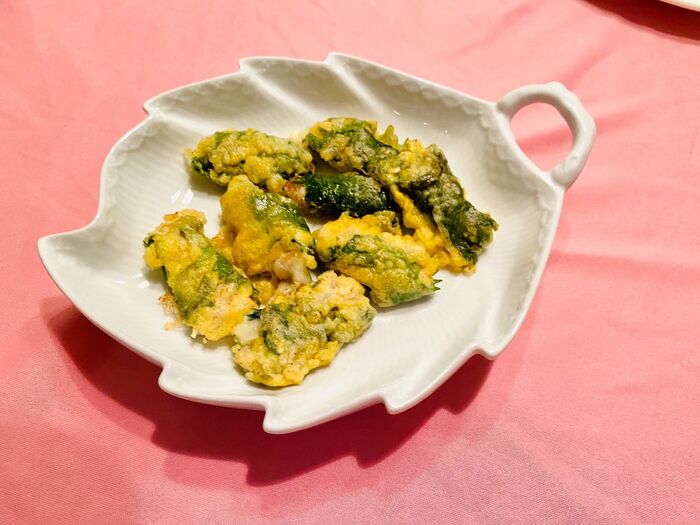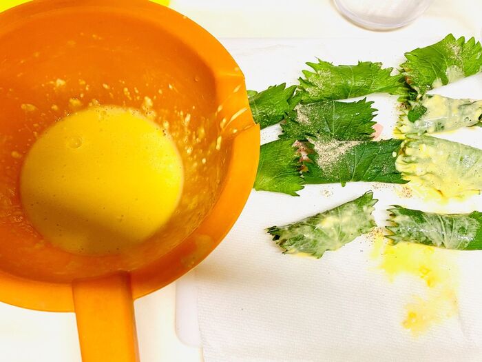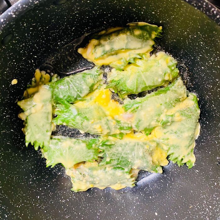 大葉を巻いて揚げ焼きシリーズは、エビも美味しいですよ。大葉は抗菌作用があるので夏のお料理には欠かせませんよ。