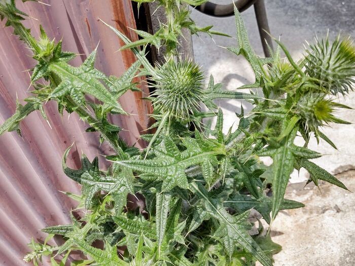 「威圧感」「強さ」の花言葉は、「アメリカオニアザミ」にぴったりですね。トゲの塊で、武器や凶器になりそうな植物です。