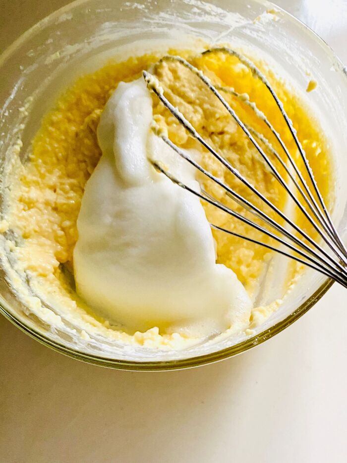 ☆に角が立つまで混ぜた卵白を入れ、さっくり、さっくり混ぜます。