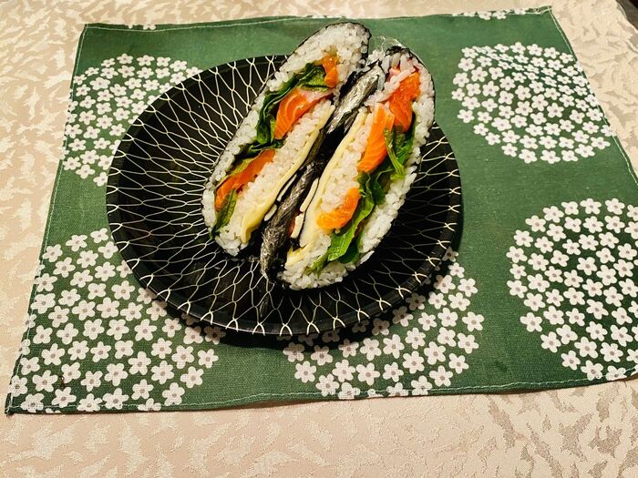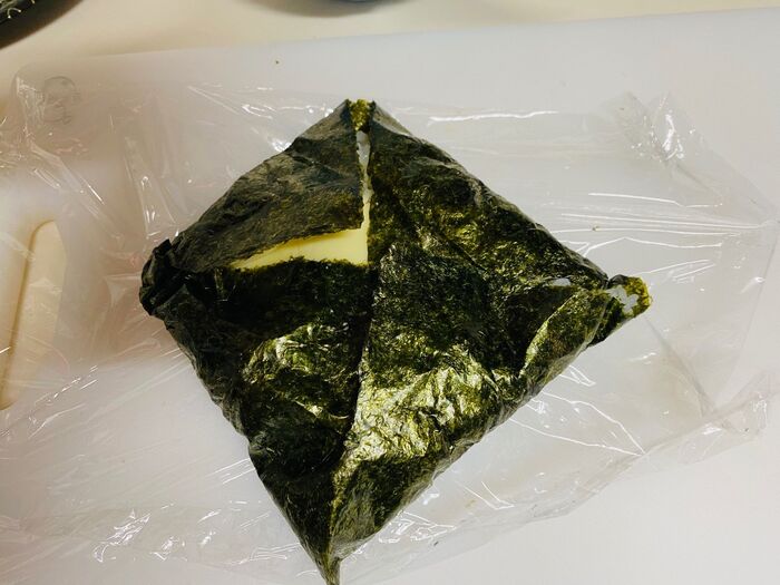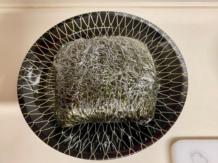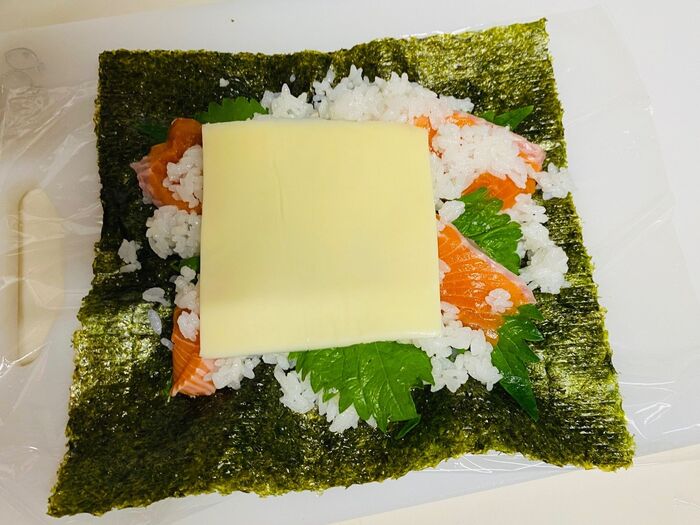 その上にご飯の半分の量を真ん中に正方形になるように乗せます。