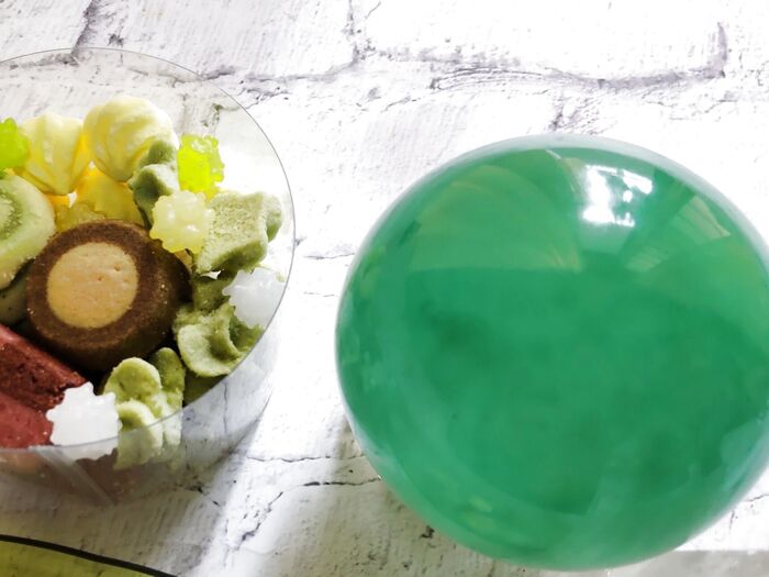 形も可愛く、明るいグリーンや紫色の焼き菓子、黄色い日向夏メレンゲ、カラフルな金平糖などの色の組み合わせが、とても良いですね、美しいです。