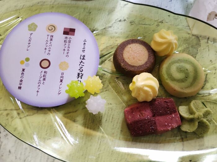 抹茶とバニラのロールクッキー、小豆とカカオの市松クッキー、ずんだサブレ、和紅茶とメープルのクッキー、日向夏メレンゲ、夏色の金平糖です。