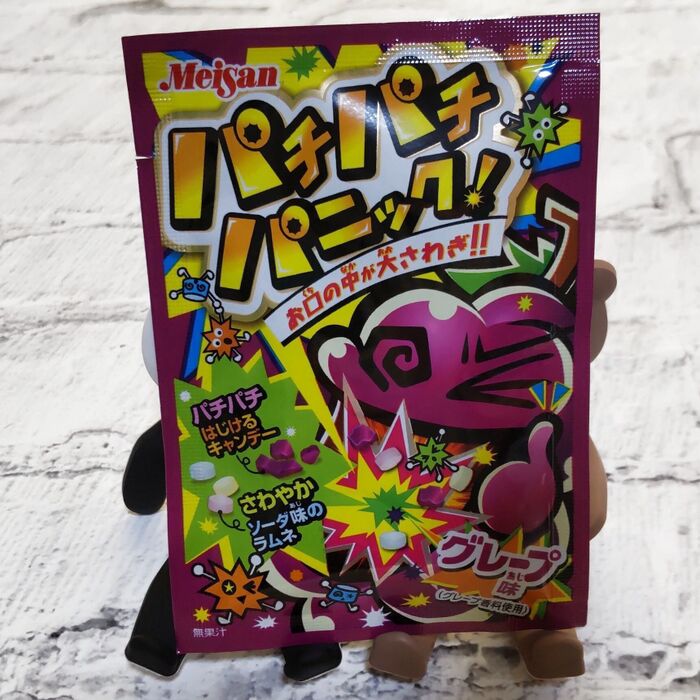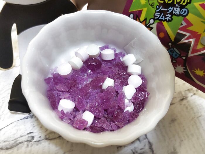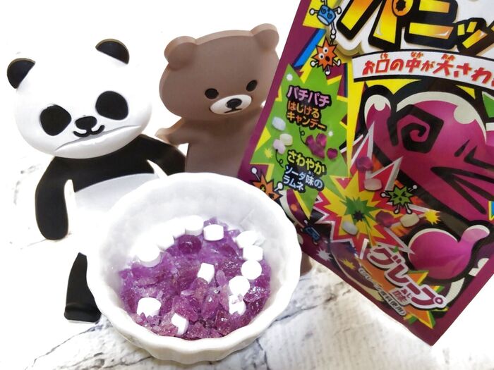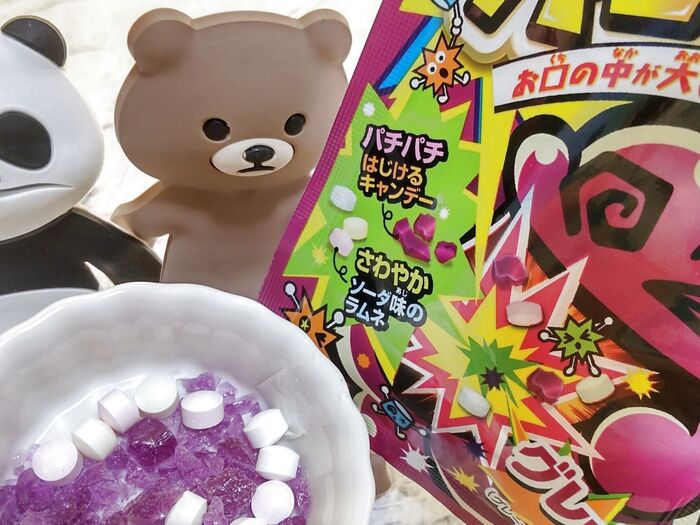 中には、ソーダ―味のラムネと紫色のパチパチ弾けるキャンディーが入っています。ラムネって、昔から入っていたっけ?紫色のパチパチ弾ける食べ物は、そうそう、こんな感じ!