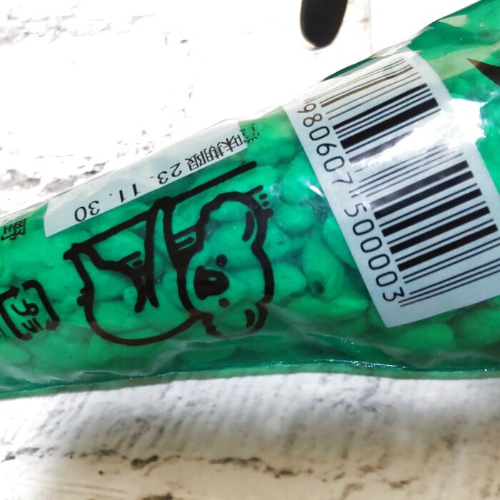 赤と黄と緑のパッケージの中に、お菓子が入っているんです。お店に3色陳列されていて、緑色を選んでみましたよ。この独特の形がいいんです。インパクトのある形でしょ!