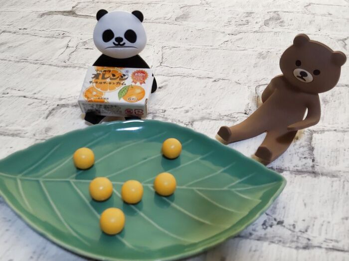 このパッケージ、懐かしいー!横は4.5cmほどで、小さい箱なんです!昭和レトロ感ありで、超可愛いです。箱状で、絵柄もオレンジやオレンジの断面で、見た目にも可愛いんですよね。ミニチュアにしたら、もっと可愛いんだろうね。