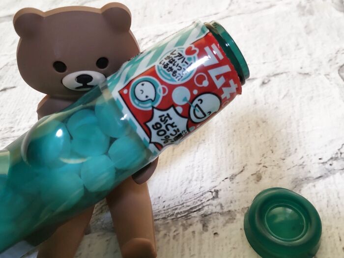 なんといっても、やっぱり、ラムネ瓶を模した形のボトルが可愛いんです。食べ終わっても、他のラムネや小さなお菓子を詰めて、また、使いたくなりますね。