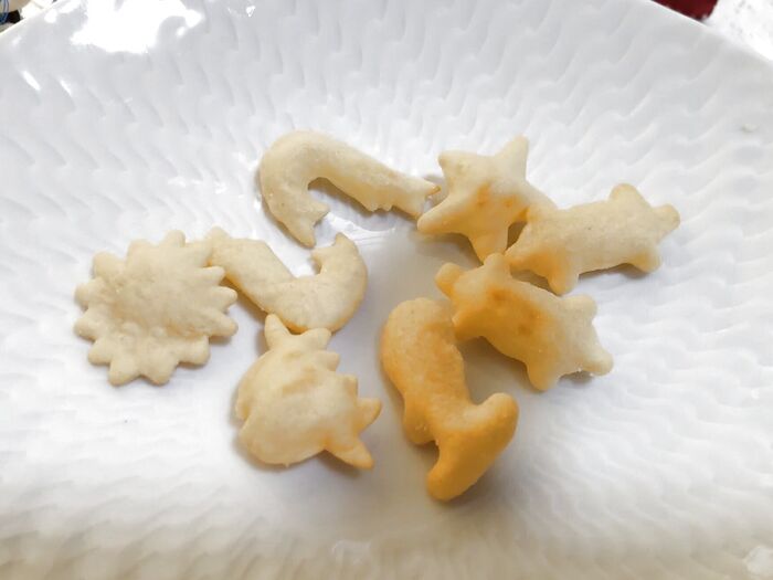 このようなスナックが入っています。可愛いでしょ!甘くなくて、いくらでも食べられそうな優しい味。美味しいんです。