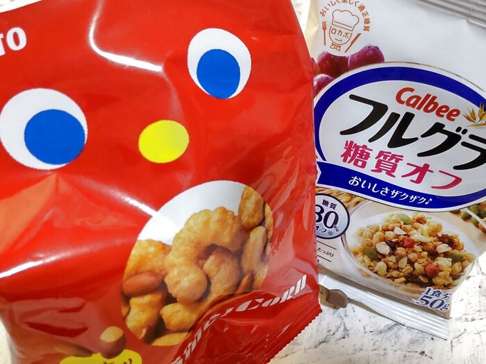 「ダイソー」さんで、いろいろな小袋サイズのお菓子2個を選んで100円だったので、グラノーラ(フルグラ)と合わせて購入しました。