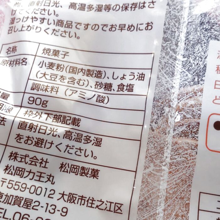 内容量は90g入り。材料は厳選された小麦粉と少量の水と塩、そして砂糖としょう油ととてもシンプルな材料で作られています。