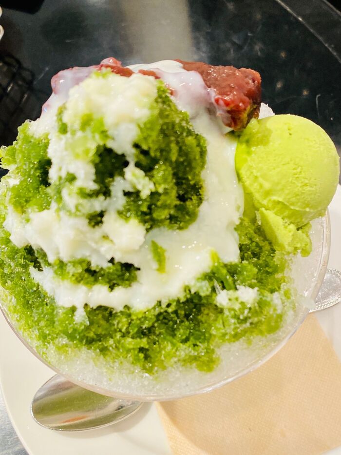 抹茶のかき氷は練乳、粒あん、抹茶アイスもついて980円ですよ。
