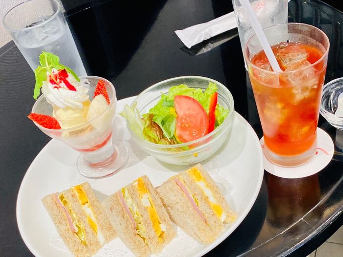 サンドイッチセットです。いちごパフェ、サラダもいついていますよ。