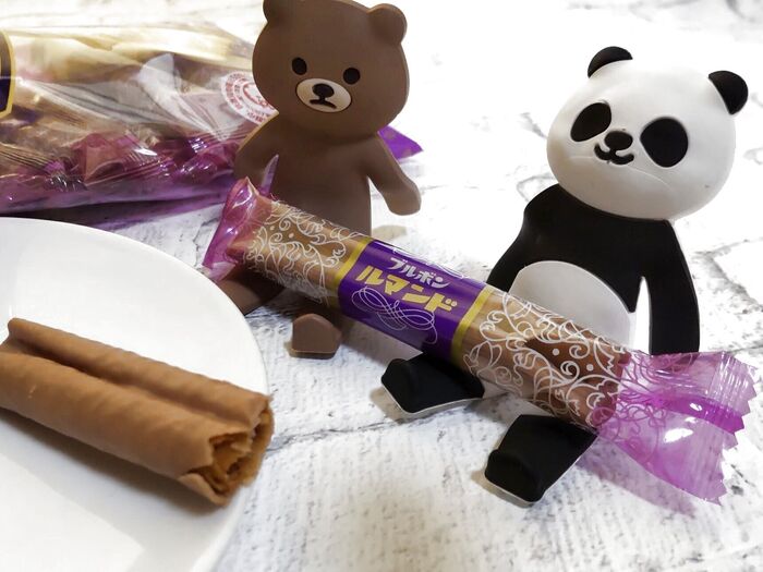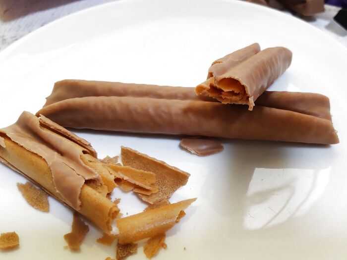 ココアクリームをクレープクッキーにまとわせてかためてあります。