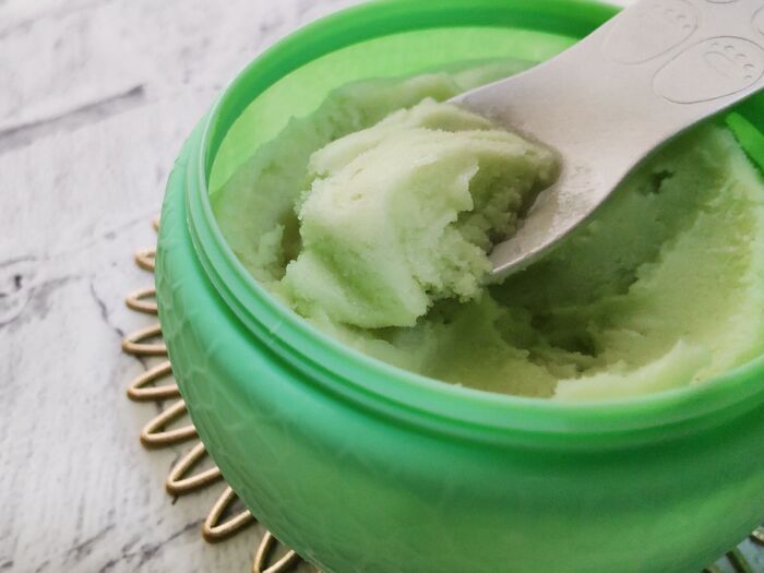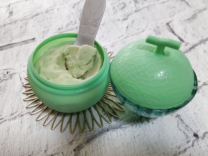 蓋を開けると、このようなメロン風味でメロン色のアイスがたっぷり入っているんです。